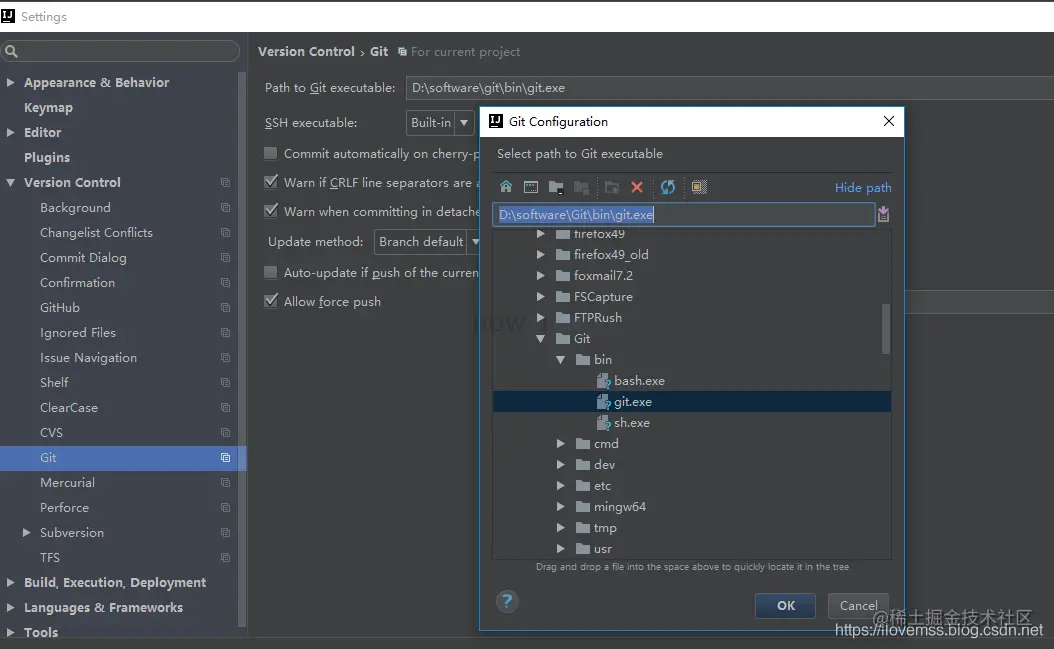 IDEA下配置git,为IDEA指定git路径,默认情况下,IDEA是不自带git运行程序的,所以需要通过