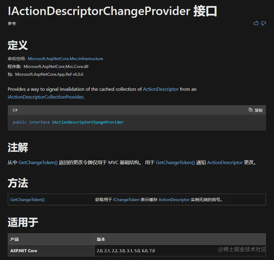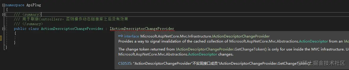 但是如果真的就这么简单,那我也不会写这篇文章了,因为我在使用的过程中发现,我通过这个库把动态链接库加载上来之后,我的Api接口并没有发生变化,也就是我们的Controller,我们知道其实WebApi就是MVC框架少了View层,所以我在AspNetCore.Mvc的库下找到了刷新控制器的方法IActionDescriptorChangeProvider