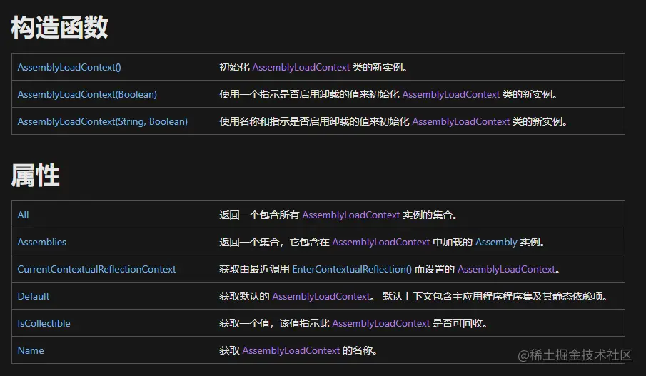 官方文档往下翻,可以看到这个类有一个属性IsCollectible是值上下文能否被回收的,同时,构造函数中也为我们提供了方法去设置这个值,我们想要卸载动态链接库的化就必须要把这个熟悉设置成true