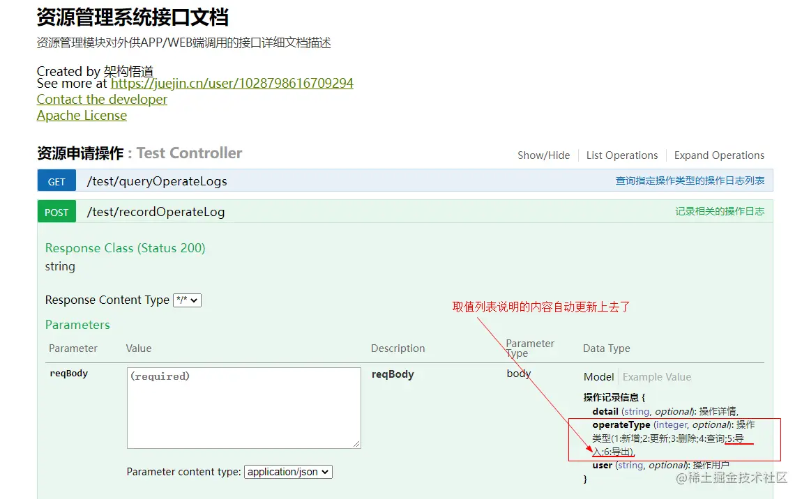 但是上面的两个写法,都存在着同一个问题,就是如果枚举类中的值内容含义有变更,比如OperateType枚举类中新增了一个BATCH_DELETE(5, "批量删除"), 则必须手动去修改所有涉及的接口上的Swagger描述信息。如果有大量场景都涉及此字段,则要改动的地方就非常多,且极易漏掉(因为不好通过代码关联关系直接搜索到)。这样对于开发人员维护起来的成本就会增加,久而久之会导致接口文档的内容与实际代码处理情况不相匹配。