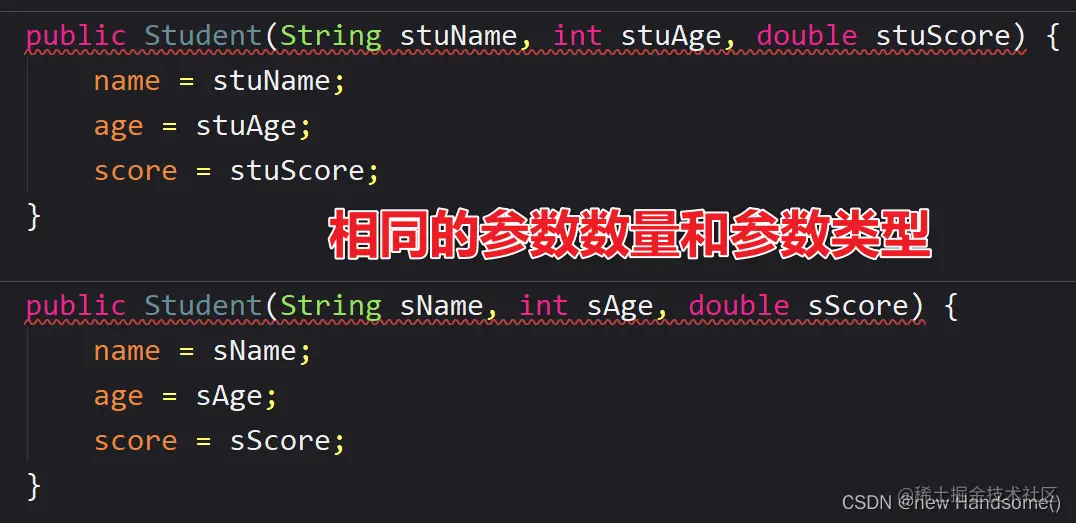 📝 两个构造方法(有参构造方法和无参构造方法)都可在 Student 类中被声明,因为它们有不同的参数列表。与成员方法一样,Java 平台可通过参数数量和参数类型来区分构造方法。在同一个类中,你不能写两个拥有相同参数数量和参数类型的构造方法,因为 Java 平台无法区分。写两个拥有相同参数数量和参数类型的构造方法将会导致编译时错误。