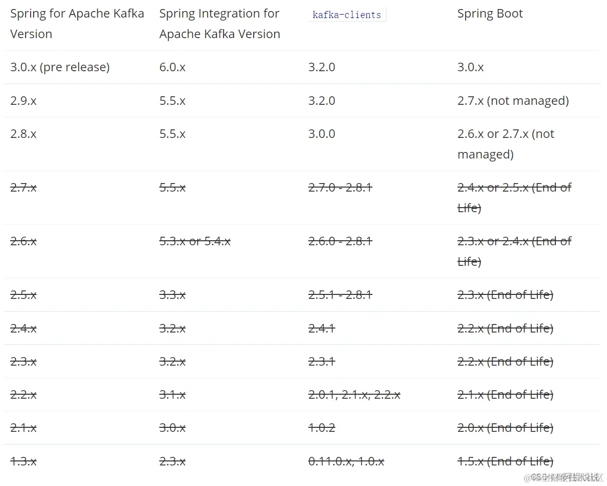 从官方下载Kafka,选择对应Spring Boot 的版本,好在Kafka支持的版本范围比较广,当前最新版本是3.2.1,支持2.12-3.2.1 范围的版本,覆盖了Spring Boot 2.0x-Spring Boot 3.0.x。
