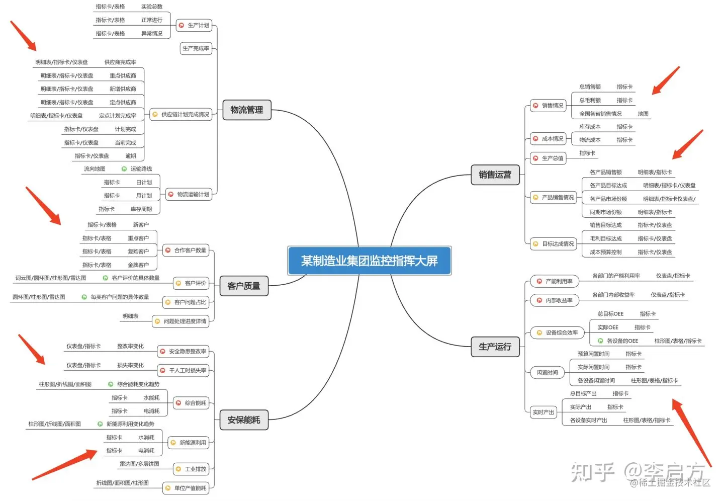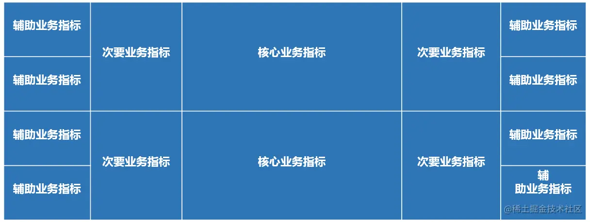版式不是唯一的,只是通常推荐的主次分布版式,能让信息一目了然。实际项目中,不一定使用主次分布,也可以使用平均分布,或者可以二者结合进行适当调整。比如下图所示,指标很多或存在多个层级的,就根据上面所说的基本原则进行一些微调,效果会很好。