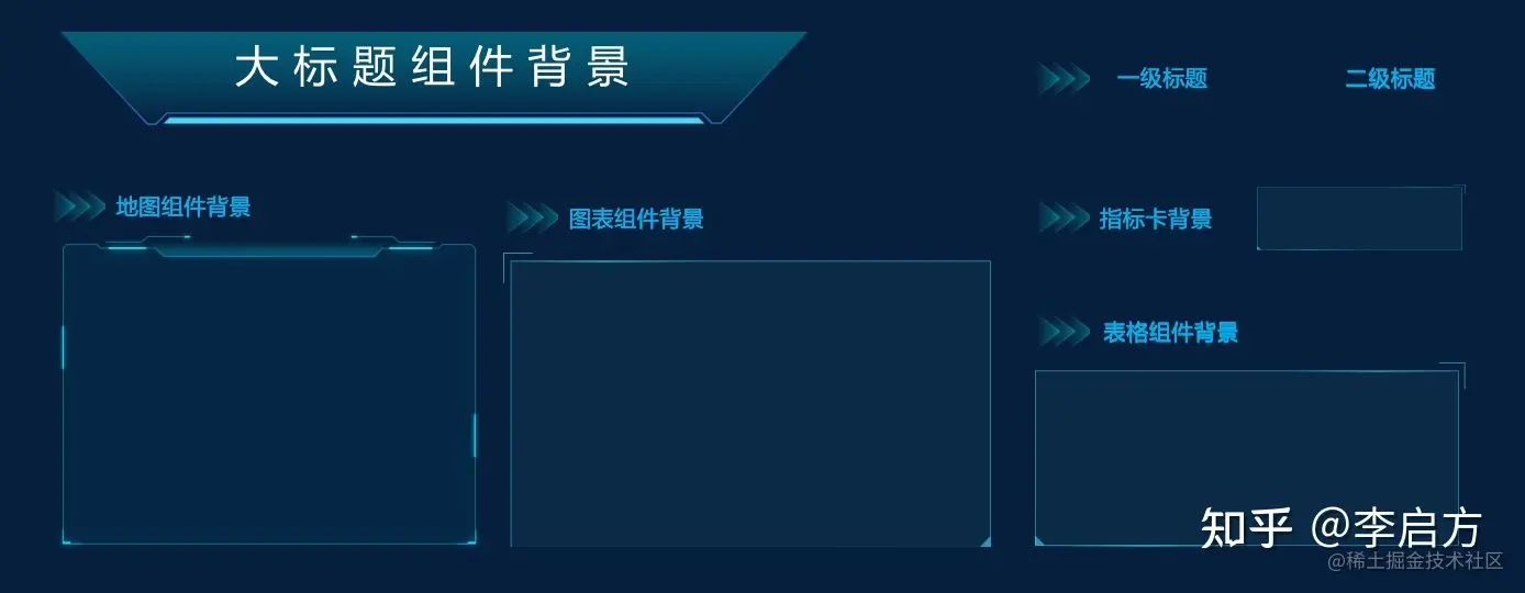 大屏画布的背景图,常用深蓝色的星空、宇宙、极光等图片,也可以设为纯色背景;组件框用于把各个模块划分开来。