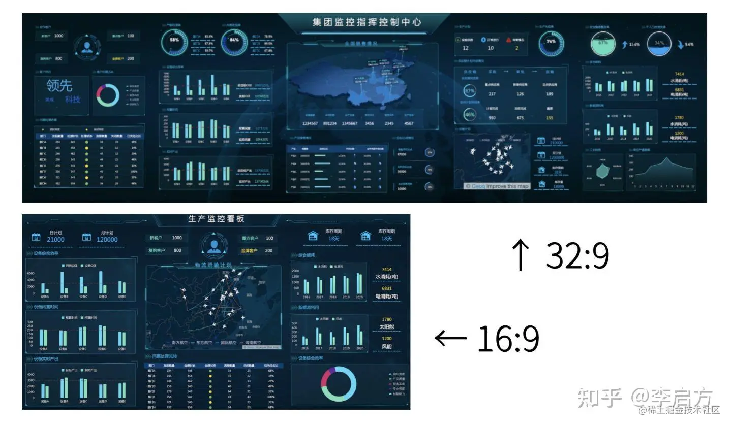后两者需要高性能显卡和大屏硬件厂家来保障,而大屏开发人员必须在了解这两种分辨率的基础上保障所做模板的分辨率是正确的。模板分辨率的“正确”包括宽高比和高清度两个要素,一般的大屏在宽高比上有16:9和32:9两种,用错比例会导致最终的投屏效果变形或填不满屏幕;