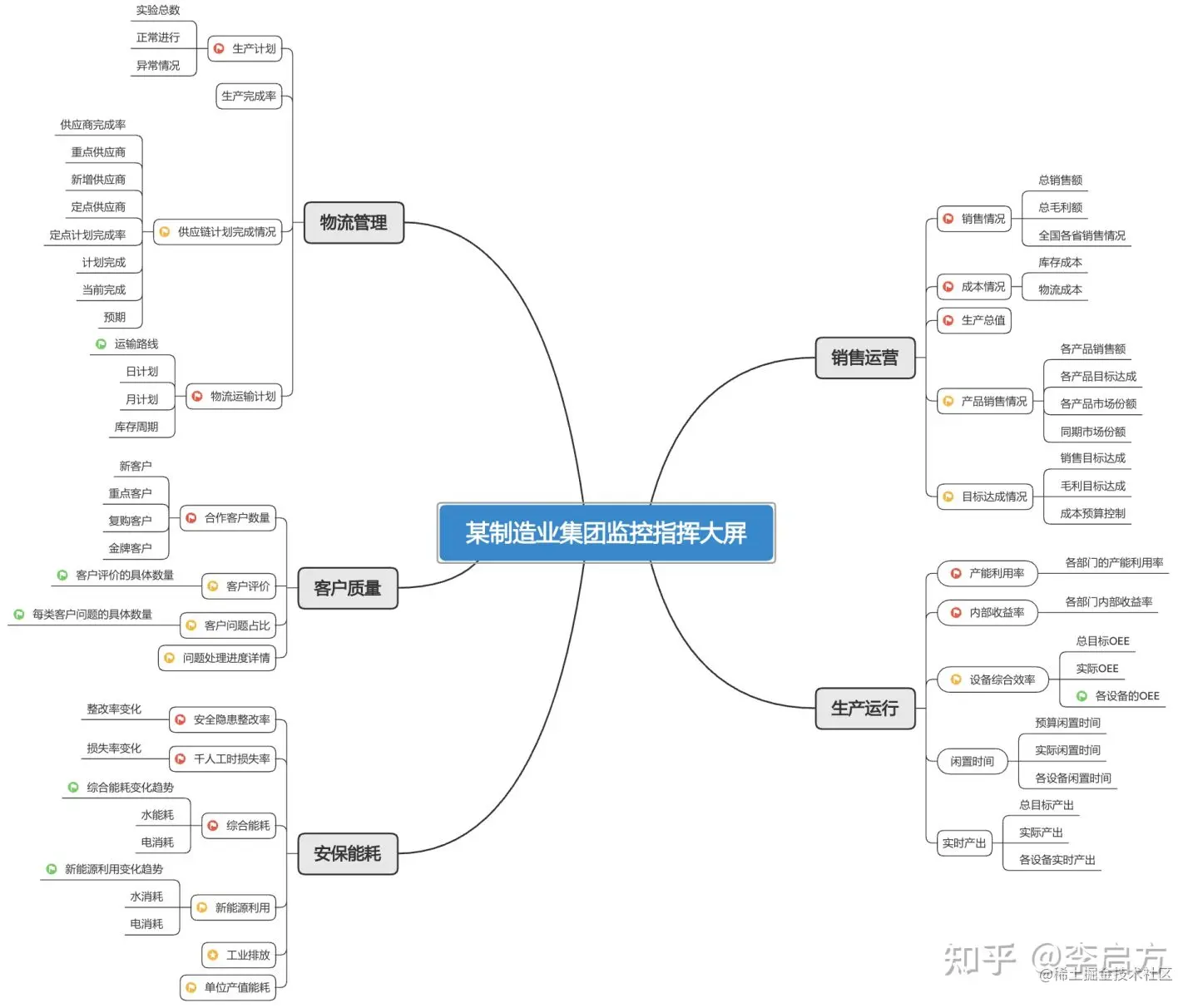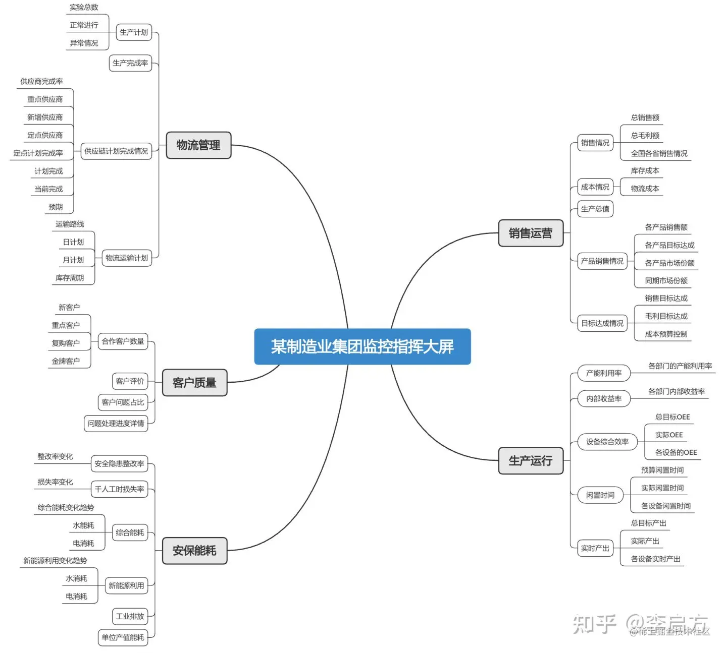 我们要与需求方沟通大屏业务场景,明确需要侧重展示的内容或大屏要呈现的“story”,根据需求提炼关键业务数据指标。 举个例子,某制造行业的监控指挥中心大屏,位于一个大型指挥管控中心,需要监控到的数据包括销售运营、生产运行、物流管理、客户质量和园区的安保能耗这5个模块,而这些就是“业务关键数据”。