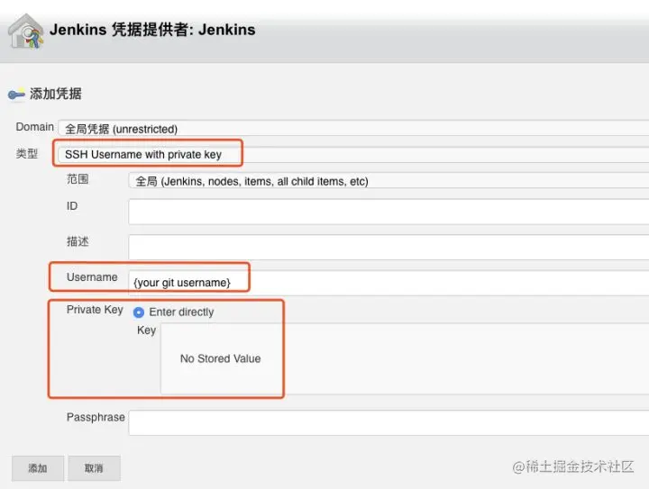 【Private Key】中填入你Git的私钥,可以使用cd ~/.ssh进行查找,将id_rsa中的内容填入即可。