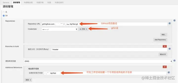 1)新建job后,在【源码管理】中选中Git,Repository URL中填入GitHub中的项目地址: