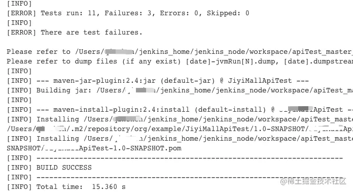 执行构建,在控制台输出中查看log,BUILD SUCCESS!构建成功,用例执行了11个,失败了3个。