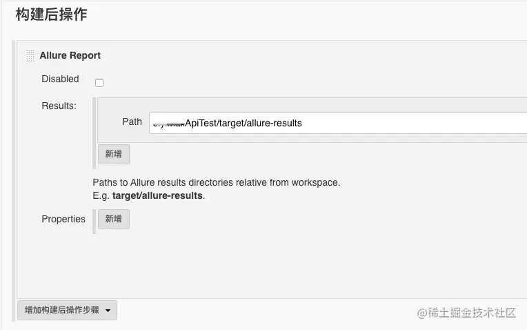 这里Results的路径要注意填写你实际的存放路径,Jenkins例子和网上很多文章都直接写了填写target/allure-results,如果你的路径不对,肯定就找不到数据;比如我这里在前面已经设置了一个项目子目录,所以要填入子目录的路径。