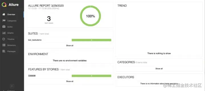 上面这个命令则会启动一个 Web 服务将已经生成的测试报告打开。打开生成的测试报告,在默认的浏览器打开测试报告,报告如下: