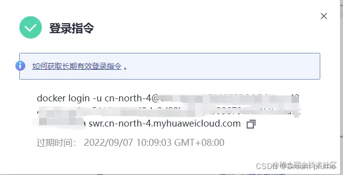 - 此处生成的登录指令有效期为24小时,若需要长期有效的登录指令,请参见获取长期有效登录指令。获取了长期有效的登录指令后,在有效期内的临时登录指令仍然可以使用。