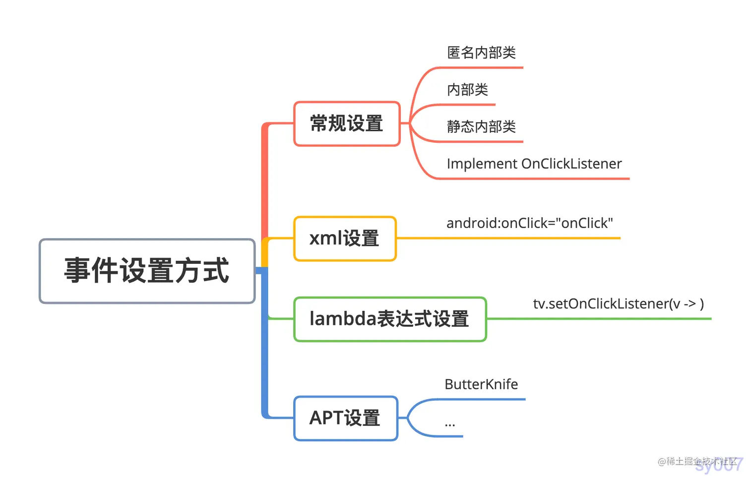 既然思路有了,接下来我们分析下Android中有哪些方式设置点击事件,以及每种方式的应该怎么处理。毕竟Android中可不止 setOnClickListener(new OnClickListener(){});这一种设置点击事件的方式。这里以View设置onClick事件举例。