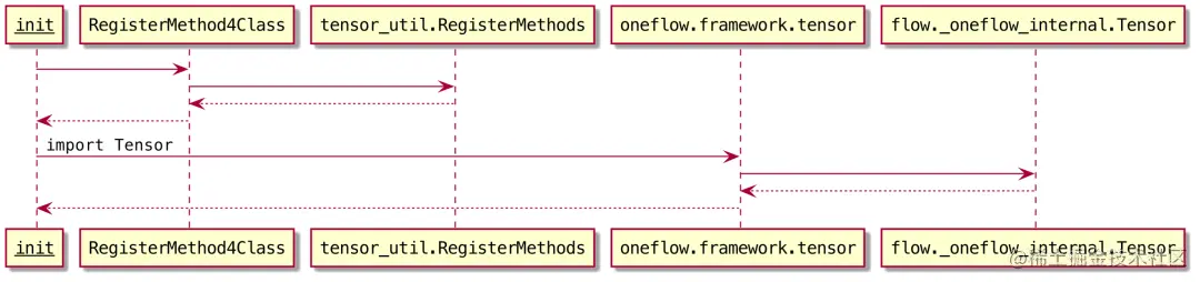 此外,在Python层通过RegisterMethods(github.com/Oneflow-Inc… )也为Tensor注册了一些Python实现的Tensor方法或属性(如tensor.numpy),在OneFlow包初始化时会通过RegisterMethod4Class(github.com/Oneflow-Inc… )完成这些Python方法和属性的注册。RegisterMethod4Class的调用流程如下: