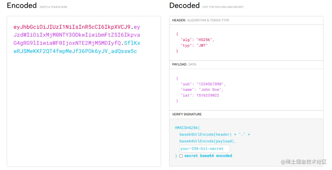注意:secret是保存在服务器端的,jwt的签发生成也是在服务器端的,secret就是用来进行jwt的签发和jwt的验证,所以,它就是你服务端的私钥,在任何场景都不应该流露出去。 一旦客户端得知这个secret, 那就意味着客户端是可以自我签发jwt了。