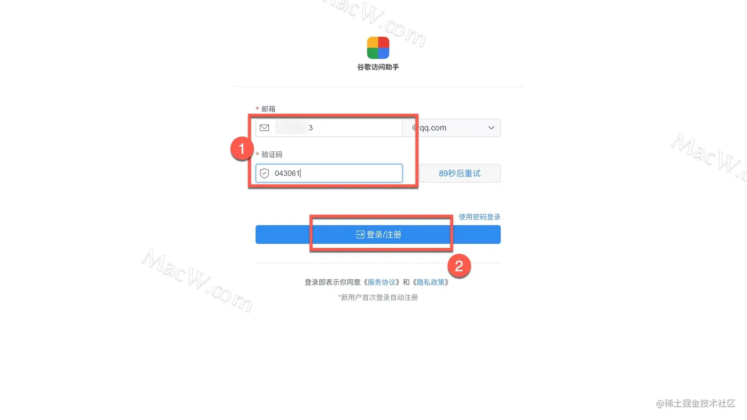 填入自己的邮箱并获取验证码,点击登录/注册