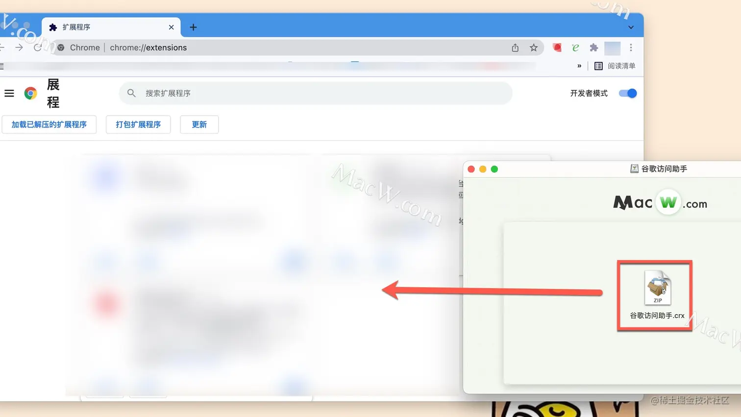 打开谷歌访问助手镜像包,将谷歌访问助手.crx拖到扩展页面