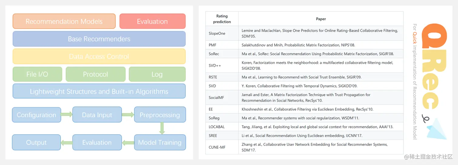 QRec 是一个用于推荐系统的Python框架(支持Python 3.7.4和Tensorflow 1.14+),其中实现了一些有影响力的、最新的推荐模型。QRec 有一个轻量级的架构,可以促进模型的实现和评估,并提供用户友好的界面。