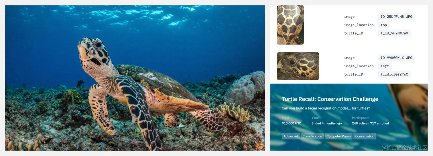 因此 DeepMind 与 Zindi 合作,发起了一项名为 Turtle Recall 的机器学习挑战赛,通过海龟面部各异且稳定的鳞片图案识别,提高海龟重新识别的可靠性和速度。