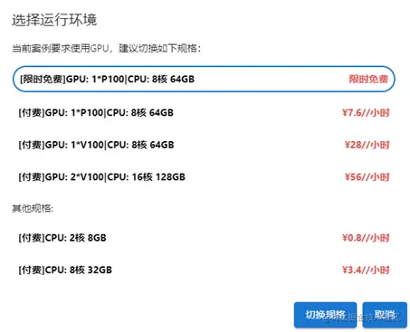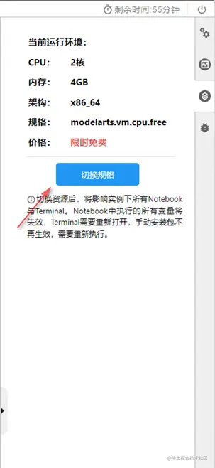 打开后使用的是免费的cpu规格,在使用过程中可以切换到免费或者付费算力规格使用: