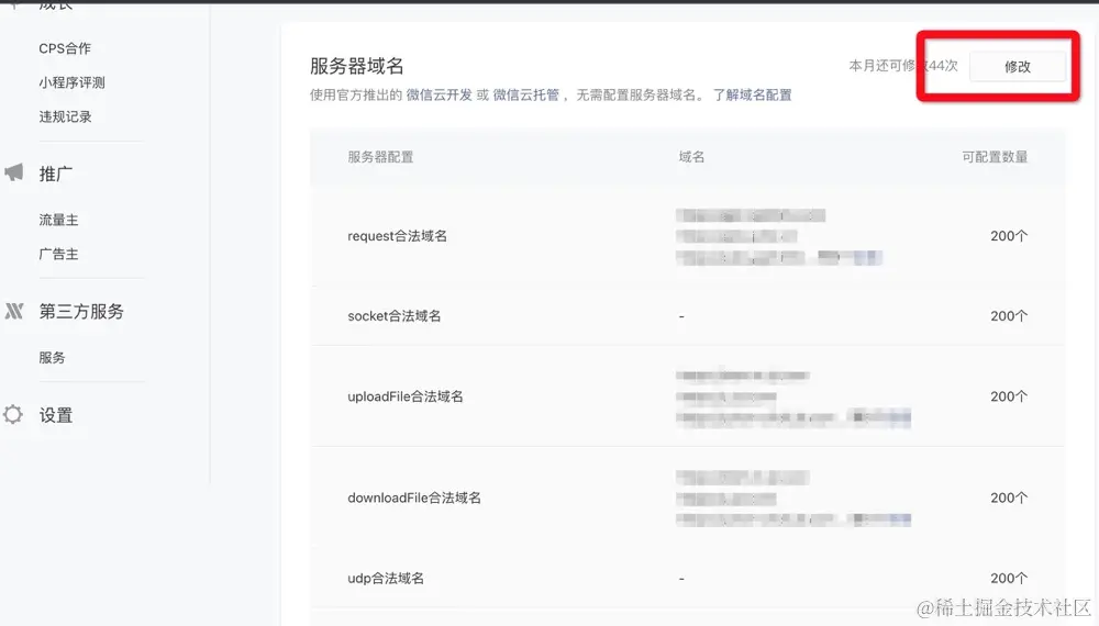 **解决方法:**需要登录小程序平台 -> 开发管理 -> 开发设置 -> 服务器域名 右上角修改(一个月50次机会)。如果小程序要打开页面,页面的域名也需要添加在这里。
