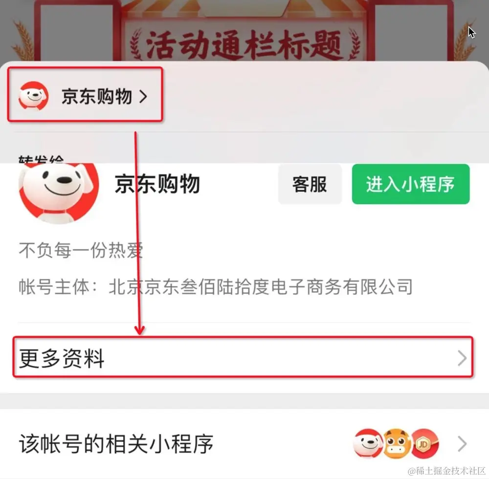 3. 微信打开想要获取页面的小程序,点击右上角三个点,选择小程序名称,再选择更多资料。