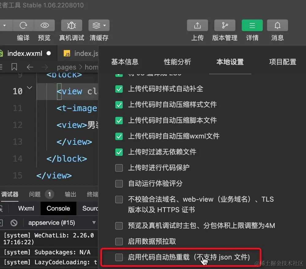 **解决方法:**开发工具右上角“详情” -> “本地配置”,将“自动热重载”勾掉就可以了