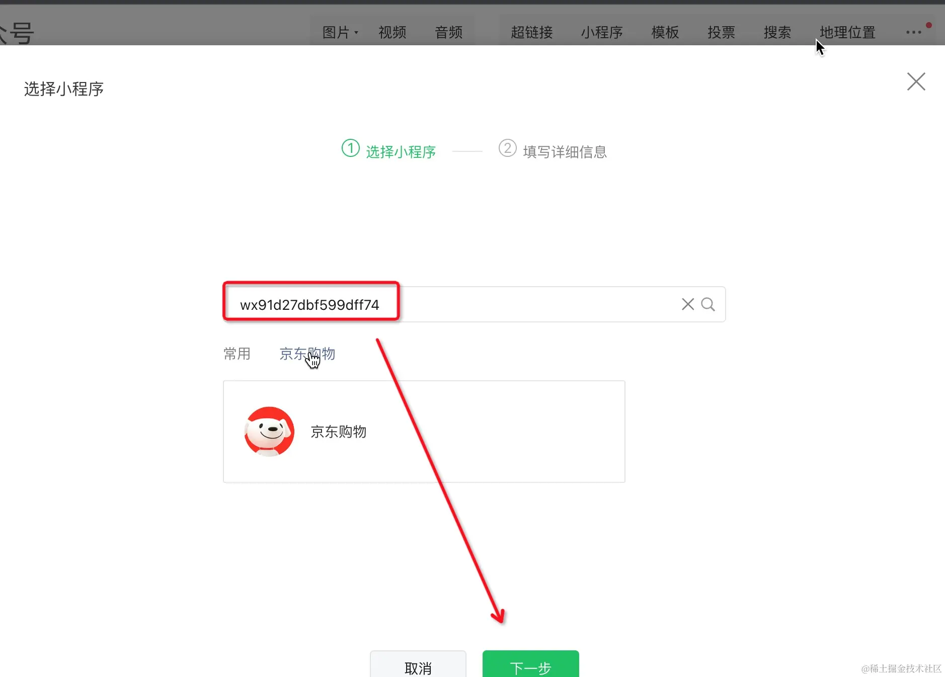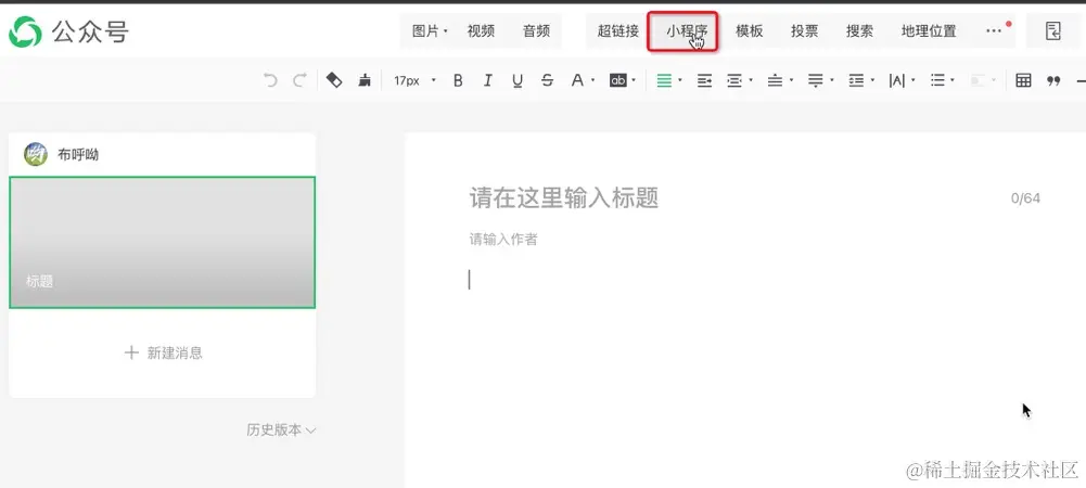 1. 登录公众号后台(注意不是小程序后台,小程序后台只能给自己的小程序添加权限),点击“草稿箱” -> “新的创作”,到编辑页面,再点击上方菜单栏的 “小程序”