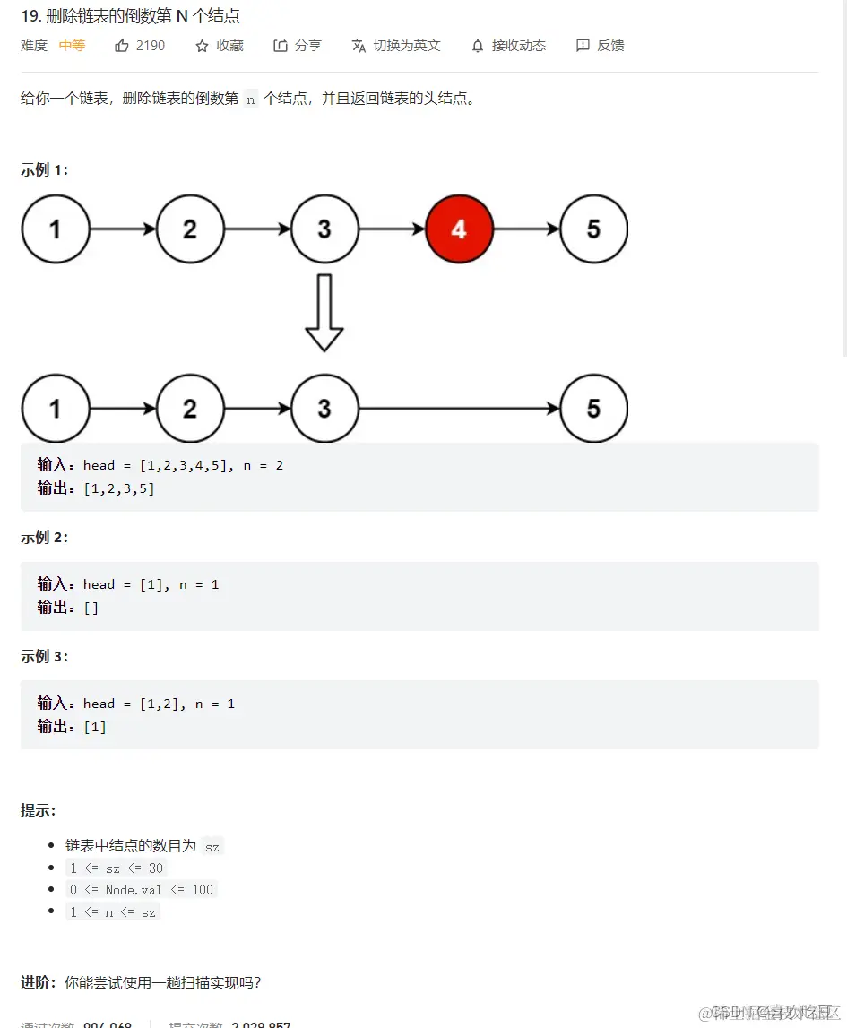 19. 删除链表的倒数第 N 个结点 - 力扣(LeetCode)https://leetcode.cn/problems/remove-nth-node-from-end-of-list/