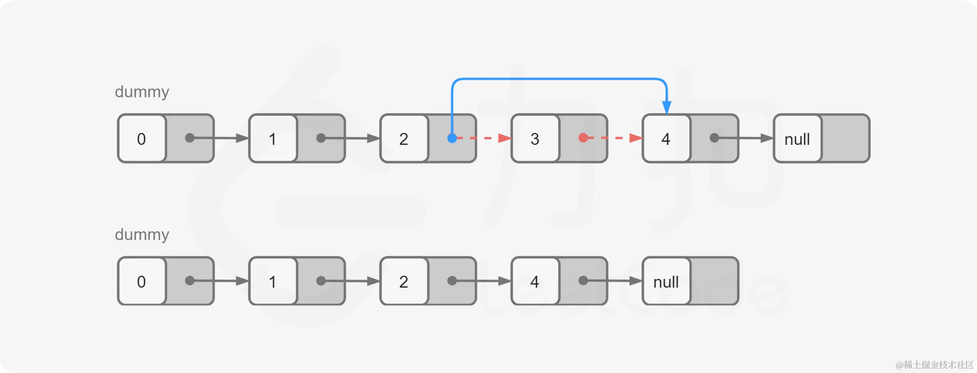 为了方便删除操作,我们可以从哑节点开始遍历L−n+1 个节点。当遍历到第L−n+1 个节点时,它的下一个节点就是我们需要删除的节点,这样我们只需要修改一次指针,就能完成删除操作。