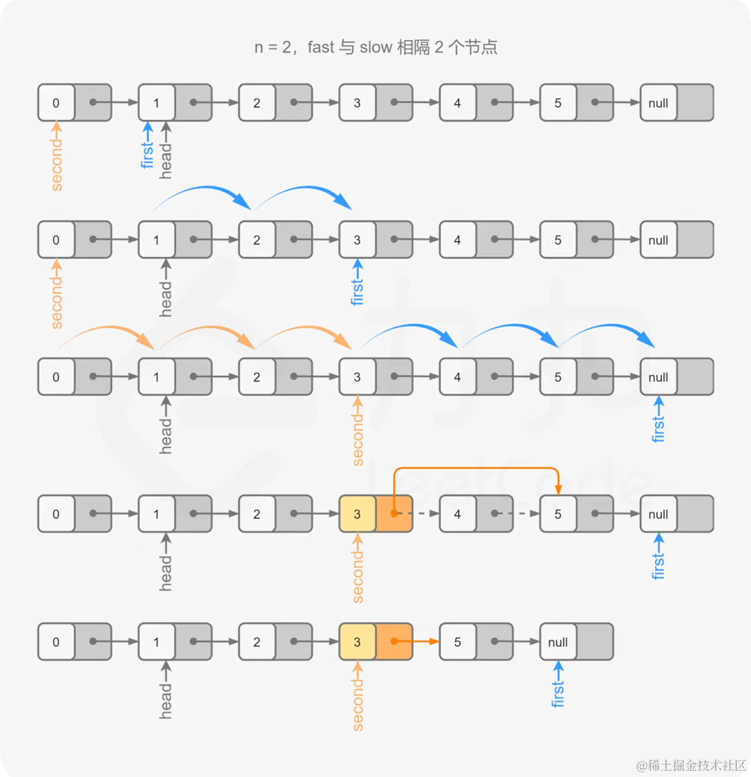 具体地,初始时 first 和 second 均指向头节点。我们首先使用 first 对链表进行遍历,遍历的次数为 n。此时,first 和 second 之间间隔了 n−1 个节点,即 first 比 second 超前了 n 个节点。