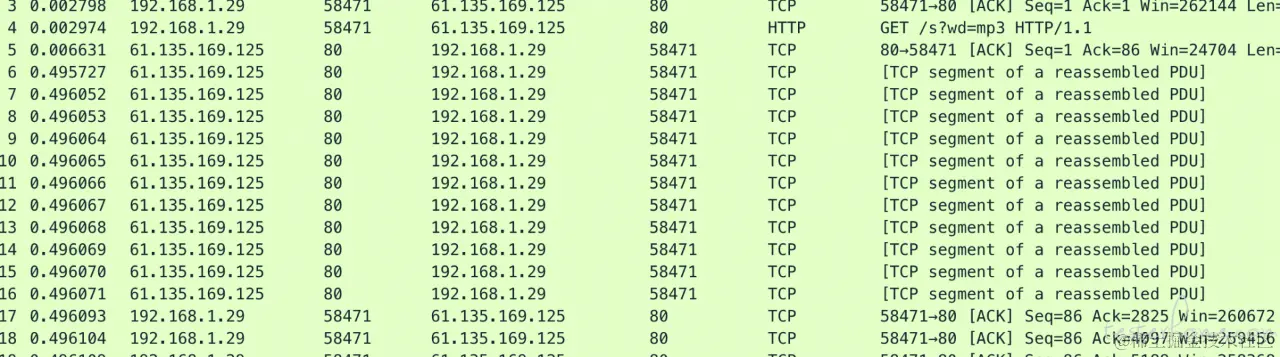 注意: 一个请求可能分为多个包,一个数据也是这样,于是在 wireshark 会看到很多包。