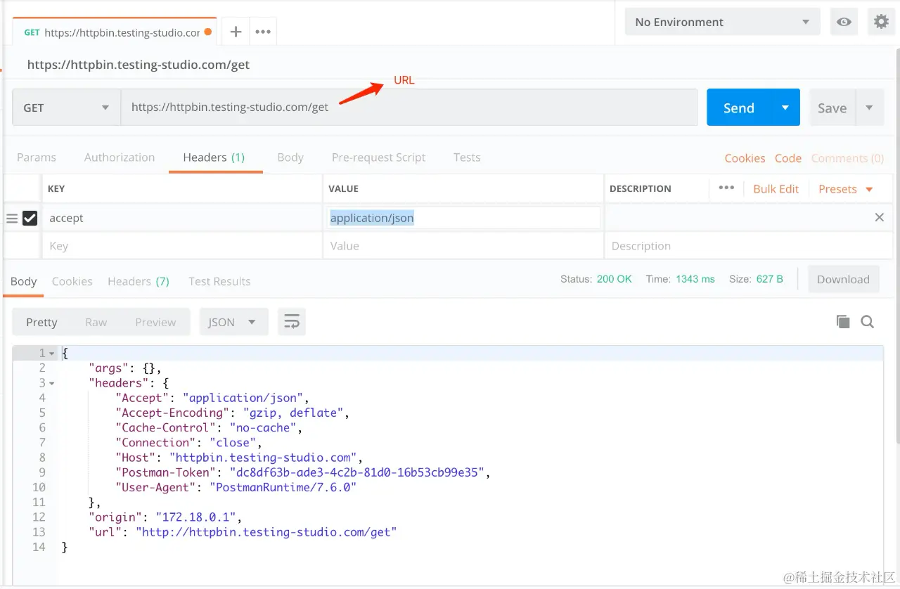 下面使用 postman 发送一次 get 请求。使用学院官方演练地址 httpbin.ceshiren.com/,进行演示