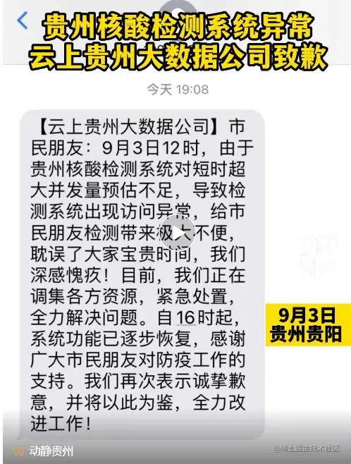 无独有偶,9月3日12时许,贵州省核酸检测系统出现异常,导致用户无法登录。当日16时起,贵州省核酸检测系统逐步恢复。云上贵州大数据公司发布信息表示歉意,并将以此为鉴,全力改进工作。
