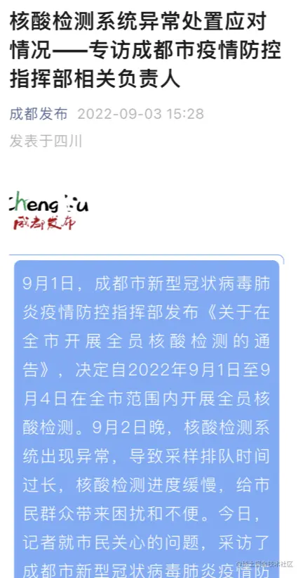 9月3日“成都发布”消息称,9月1日,成都市新型冠状病毒肺炎疫情防控指挥部发布《关于在全市开展全员核酸检测的通告》,决定自9月1日至9月4日在全市范围内开展全员核酸检测。9月2日晚,核酸检测系统出现异常,导致采样排队时间过长,核酸检测进度缓慢,给市民群众带来困扰和不便。