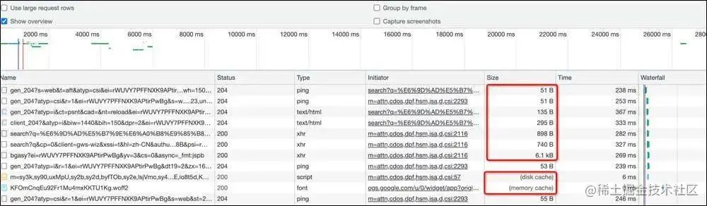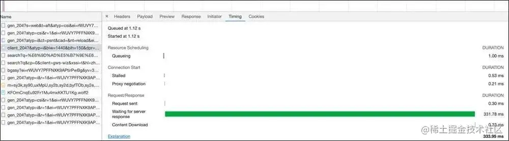 例如,前端发起请求的优化,从浏览器发起url请求,涉及浏览器对域名请求并发数限制、js/css/图片等请求文件大小、请求内容的CDN加速、请求内容的浏览器缓存等。现在大多浏览器都自带开发者诊断工具,可以有针对性的去做性能定位,下图展示了用户的请求情况和单个请求的timing耗时。