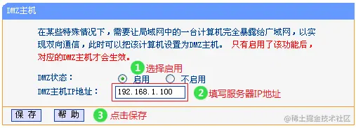 解决办法:尝试开启DMZ主机测试。在路由器管理界面点击 转发规则 >> DMZ主机,DMZ状态 选择 启用,DMZ主机IP地址 中输入服务器的IP地址,点击 保存,如下图: