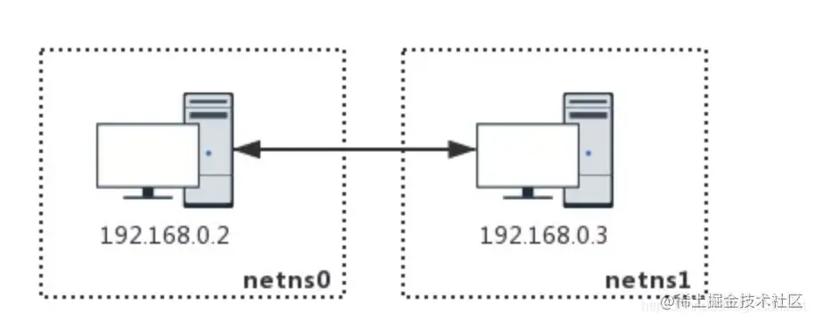 既然已经了解了网络命名空间后,那我们通过两个隔离的命名空间来实现互通(模拟两台主机直接的互通,作为网络开发人员,有时候需要很多台机器来测试网络,但是只有一台机器,那么有了网络命名空间这个特性,完全就可以在一台主机上模拟多台主机之间互通的网络测试),如下所示: