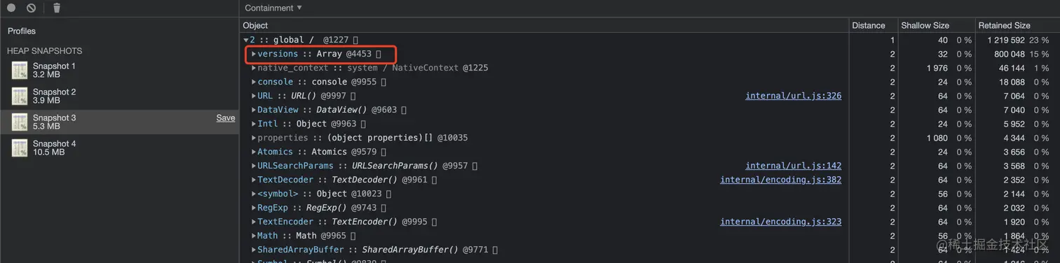 可以发现 versions 变量占用较多内存(非泄漏,测试用)