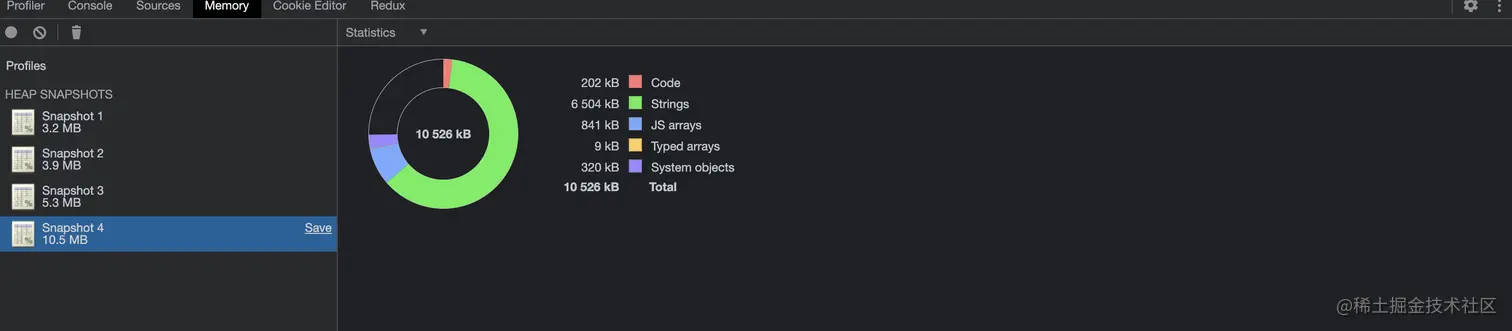 接下来通过示例代码,打印快照简单介绍一下分析工具 memory的 4 个视图