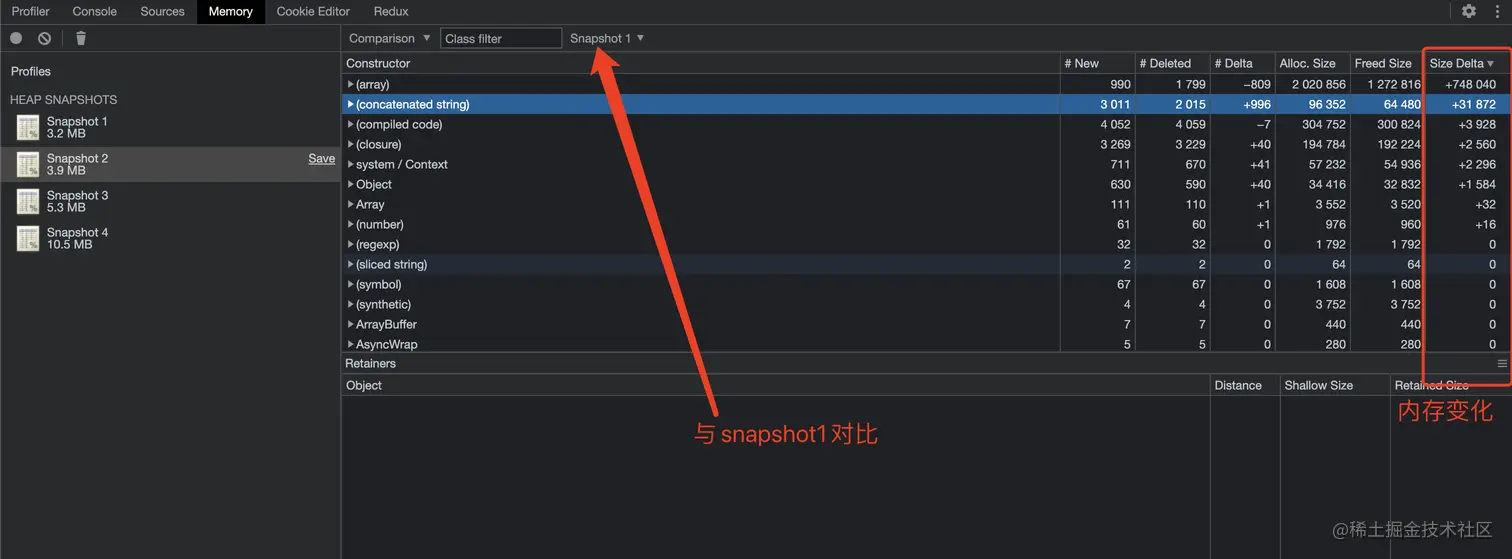 根据构造函数名分组,可以查看个构造函数的内存占用大小,也可以查询两次快照之间新申请的占用。追踪dom泄漏特别有用。