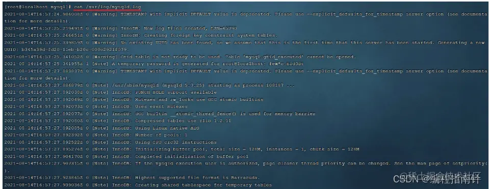MySQL启动起来之后,我们就可以测试一下登录操作,但是我们要想登录MySQL,需要一个访问密码,而刚才在安装MySQL的过程中,并没有看到让我们设置访问密码,那这个访问密码是多少呢? 那实际上,对于rpm安装的mysql,在mysql第一次启动时,会自动帮我们生成root用户的访问密码,并且输出在mysql的日志文件 /var/log/mysqld.log中,我们可以查看这份日志文件,从而获取到访问密码。