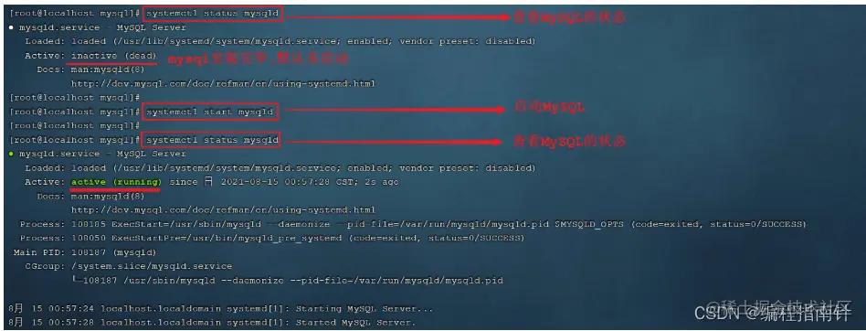 MySQL安装完成之后,会自动注册为系统的服务,服务名为mysqld。那么,我们就可以通过systemctl指令来查看mysql的状态、启动mysql、停止mysql。