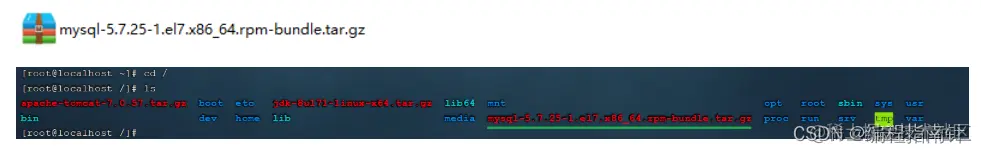 在课程资料中,提供的有MySQL的安装包 ,我们需要将该安装包上传到Linux系统的根目录 / 下面。