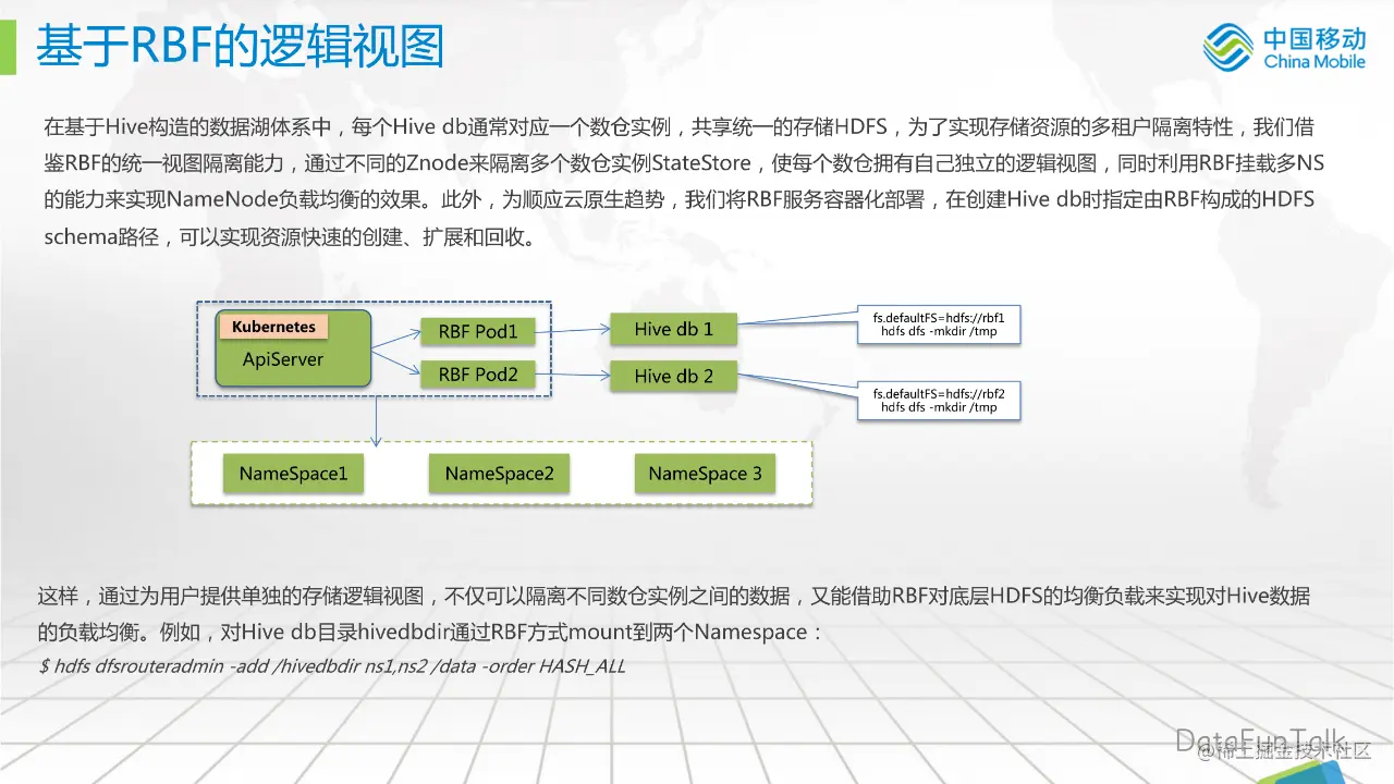 例如,对 Hive db 目录 hivedbdir 通过 RBF 方式 mount 到两个 Namespace,挂载命令如下: