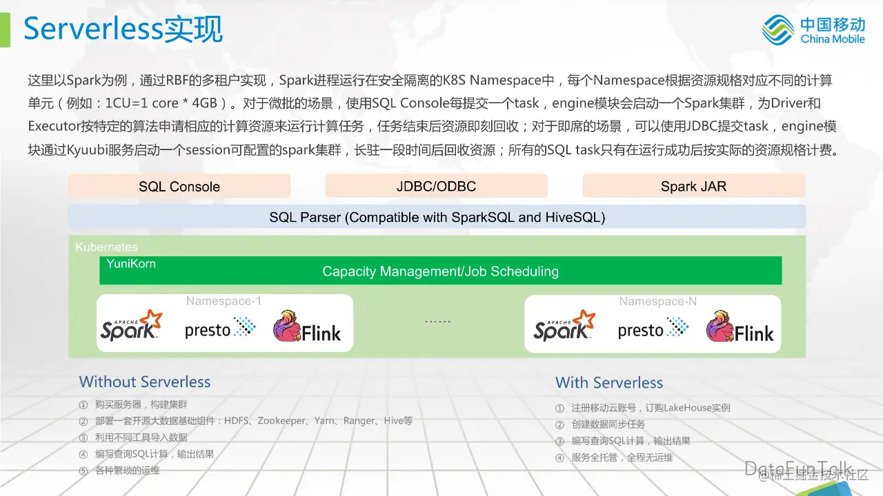 这里以 Spark 为例,通过 RBF 的多租户实现,Spark 进程运行在安全隔离的 K8S Namespace 中,每个 Namespace 根据资源规格对应不同的计算单元(例如:1CU=1 core * 4GB)。对于微批的场景,使用 SQL Console 每提交一个 task,engine 模块会启动一个 Spark 集群,为 Driver 和 Executor 按特定的算法申请相应的计算资源来运行计算任务,任务结束后资源即刻回收;对于即席 ad-hoc 的场景,可以使用 JDBC 提交 task,engine 模块通过 Kyuubi 服务启动一个 session 可配置的 spark 集群,长驻一段时间后回收资源;所有的 SQL task 只有在运行成功后按实际的资源规格计费,如果不使用是不收费的。