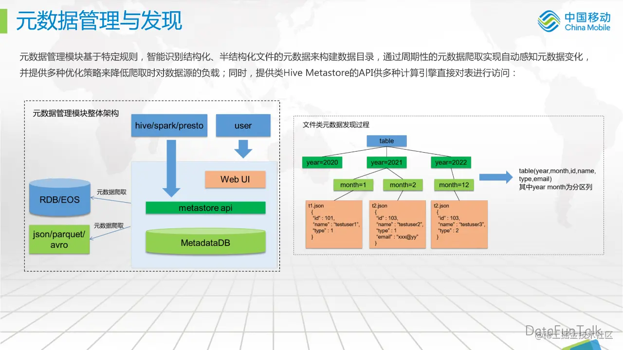 文件类元数据发现过程,如右图所示:有一张表,下面有几个目录,比如按 year 分开的,然后在某个具体目录有两个子目录,对于它的元数据发现过程,就会出现 3 行的数据,id、name 和 type,就会映射成同一张表,然后不同的目录是按不同的字段进行分区。