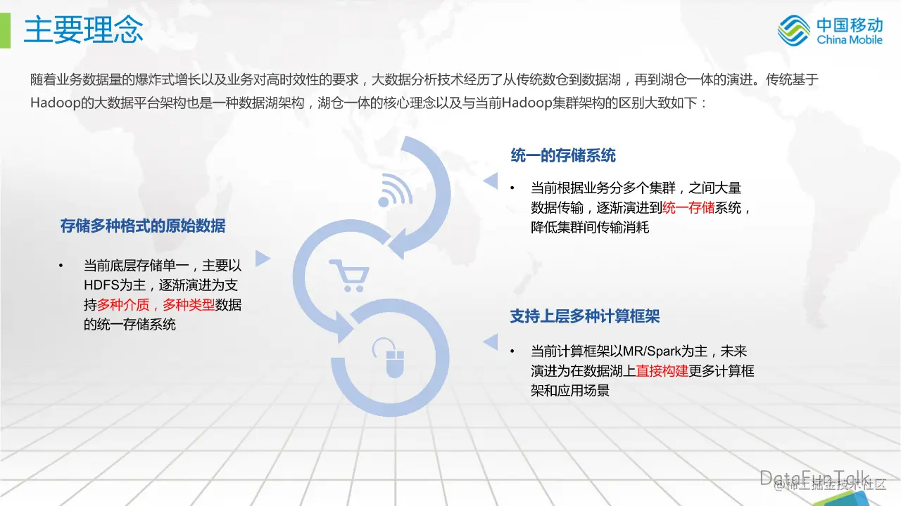 支持上层多种计算框架:当前 Hadoop 架构的计算框架以 MR/Spark 为主,未来演进为在数据湖上直接构建更多计算框架和应用场景