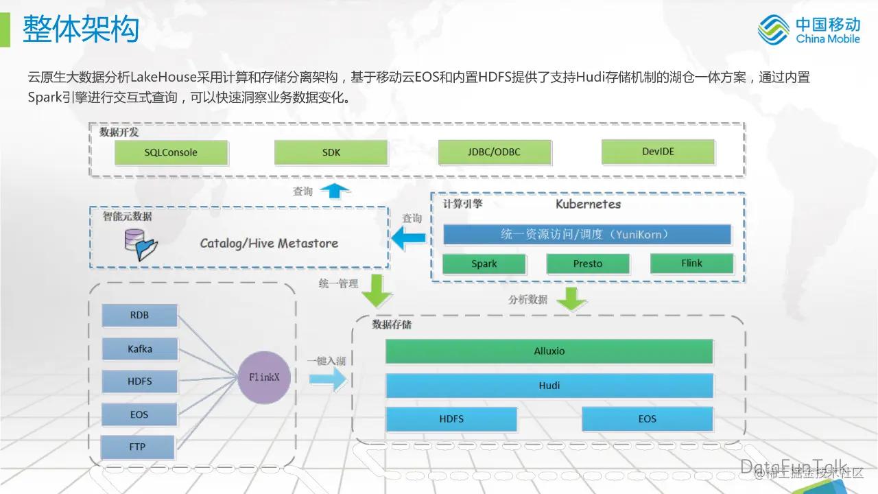 数据存储(数据湖):我们内置了 HDFS 和移动云的 EOS,借助 Hudi 实现 Upsert 能力,达到近实时的增量更新,我们还适当地引入 Alluxio,进行数据缓存,来达到数据分析的 SQL 查询加速能力。