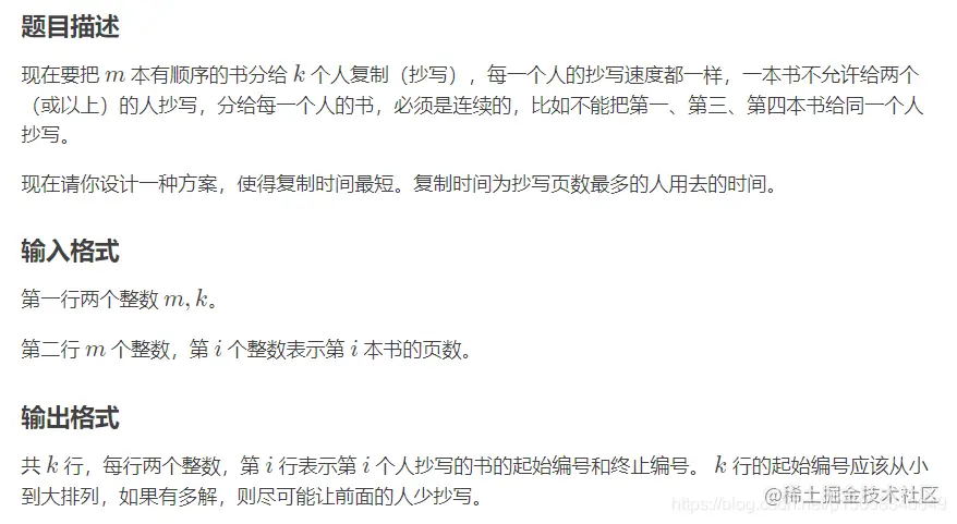 对每个人抄书的页数进行二分,最后因为是尽量让前面的人少抄写,所以应该从后往前遍历。